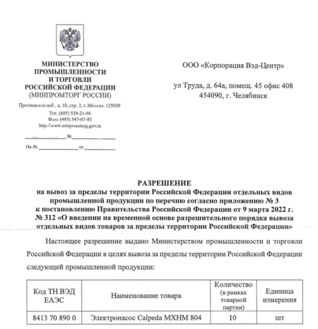 Определенный код ТН ВЭД 8413708900 попадает в перечень промышленной продукции приложения № 3 к постановлению Правительства Российской Федерации №312 от 09.03.2022г. Согласно этому, для экспорта «Электронасосов Calpeda MXHM 804» в Республику Казахстан,